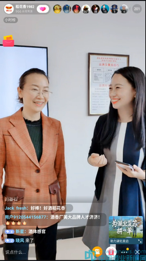 “稻花香這個品牌,你就說熟不熟悉,咱湖北人都知道。”直播主會場,稻花香酒業公司副總經理陳小磊來到直播間與主播王磊熱情互動,向廣大網友推介稻花香活力型、金珍壹號、光瓶1992三款產品,化身“云時間種草王”為消費者送福利,科普稻花香品牌由來、匠心工藝、白酒品質,引發網友廣泛關注,直播間留言、點贊、送禮持續刷屏。網友紛紛表示:“活力的背后,更多的是希望”“稻花香威武,咱們一起為宜昌助力”……一時間,直播間引發了為稻花香帶貨買單的熱潮。