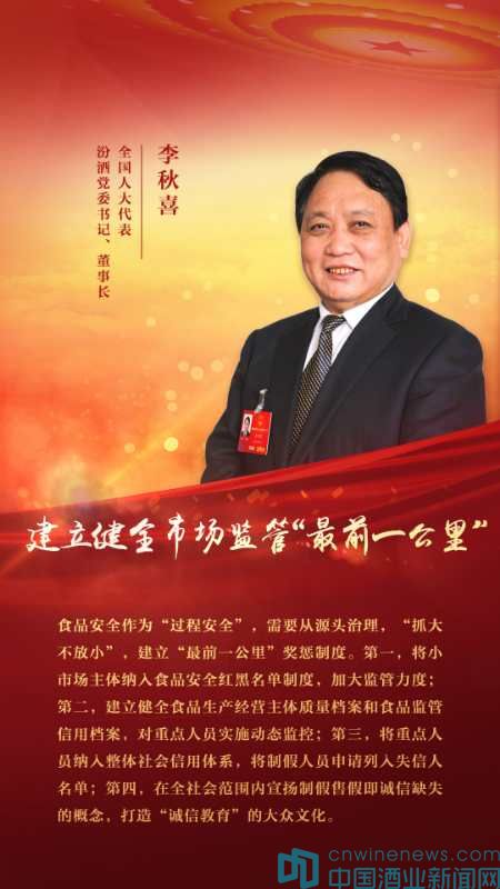 在正在召開的第十三屆全國(guó)人民代表大會(huì)期間,全國(guó)人大代表、汾酒黨委書記、董事長(zhǎng)李秋喜提交了“酒類食品安全建設(shè)”方面的議案,在會(huì)期發(fā)言時(shí)提出,以人民為中心,打擊造假,加強(qiáng)生產(chǎn)許可證管理,樹立行業(yè)標(biāo)準(zhǔn),加強(qiáng)食品安全管理,讓人人喝上放心好酒。