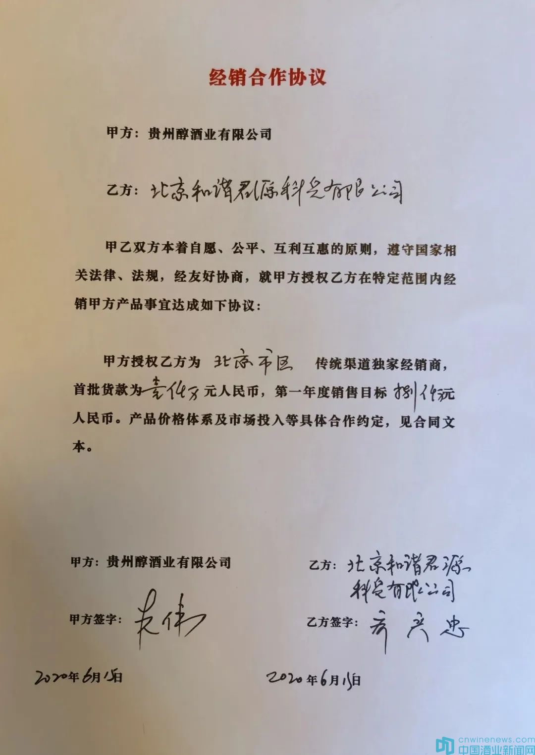6月15日,答案揭曉!中國流通企業百強之一的北京和諧君源科貿有限公司成為貴州醇酒業在北京市區傳統渠道的獨家經銷商,首批貨款1000萬元,第一年度銷售目標8000萬元。此時,距離5月11日,貴州醇簽下第一個一線城市——廣州的經銷商,僅過去35天。