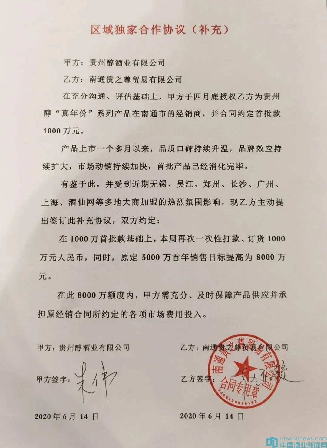 值得關注的是,6月14日,貴州醇又與南通貴之尊簽下了補充協議。協議表明,產品上市一個多月以來,品質口碑持續升溫,品牌效應持續擴大,市場動銷持續加快,首批產品已經消化完畢。雙方約定:在1000萬元首批款基礎上,本周再次一次性打款,訂貨1000萬元,同時,原定5000萬首年銷售目標提高為8000萬元。