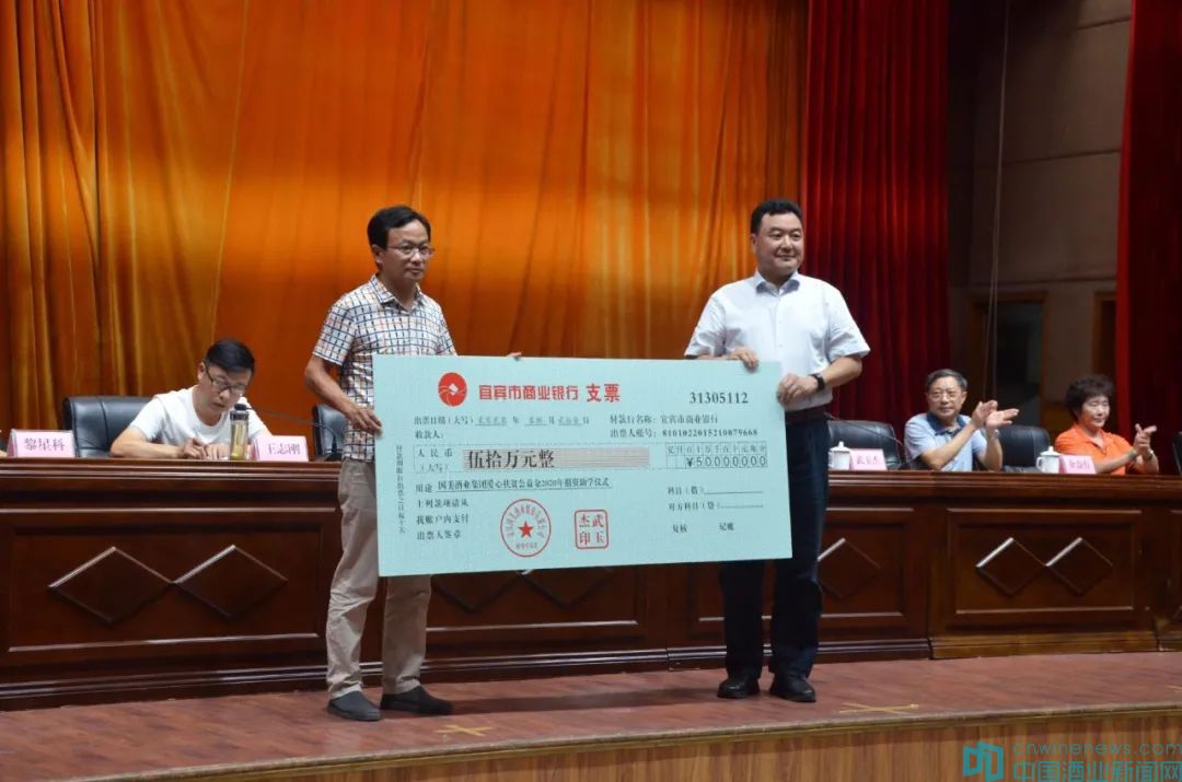 儀式上,國美酒業集團董事長武玉杰向長寧縣慈善總會捐贈助學款50萬元,資助100名貧困優秀學生完成學業,隨后出席領導向受助學生代表發放助學金儀式,受助學生代表發言。