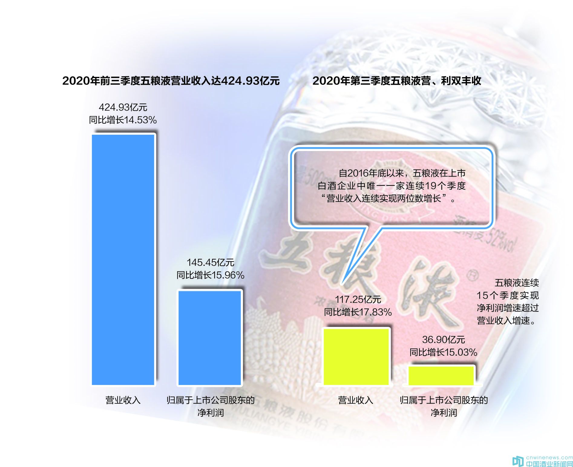 近日,宜賓五糧液股份有限公司(以下簡稱“五糧液”)發布《2020年第三季度報告》顯示,截至今年前三季度,公司實現營業收入424.93億元,同比增長14.53%;歸屬于上市公司股東的凈利潤145.45億元,同比增長15.96%。其中,第三季度單季,五糧液實現營業收入117.25億元,同比增長17.83%;歸屬于上市公司股東的凈利潤36.90億元,同比增長15.03%。
