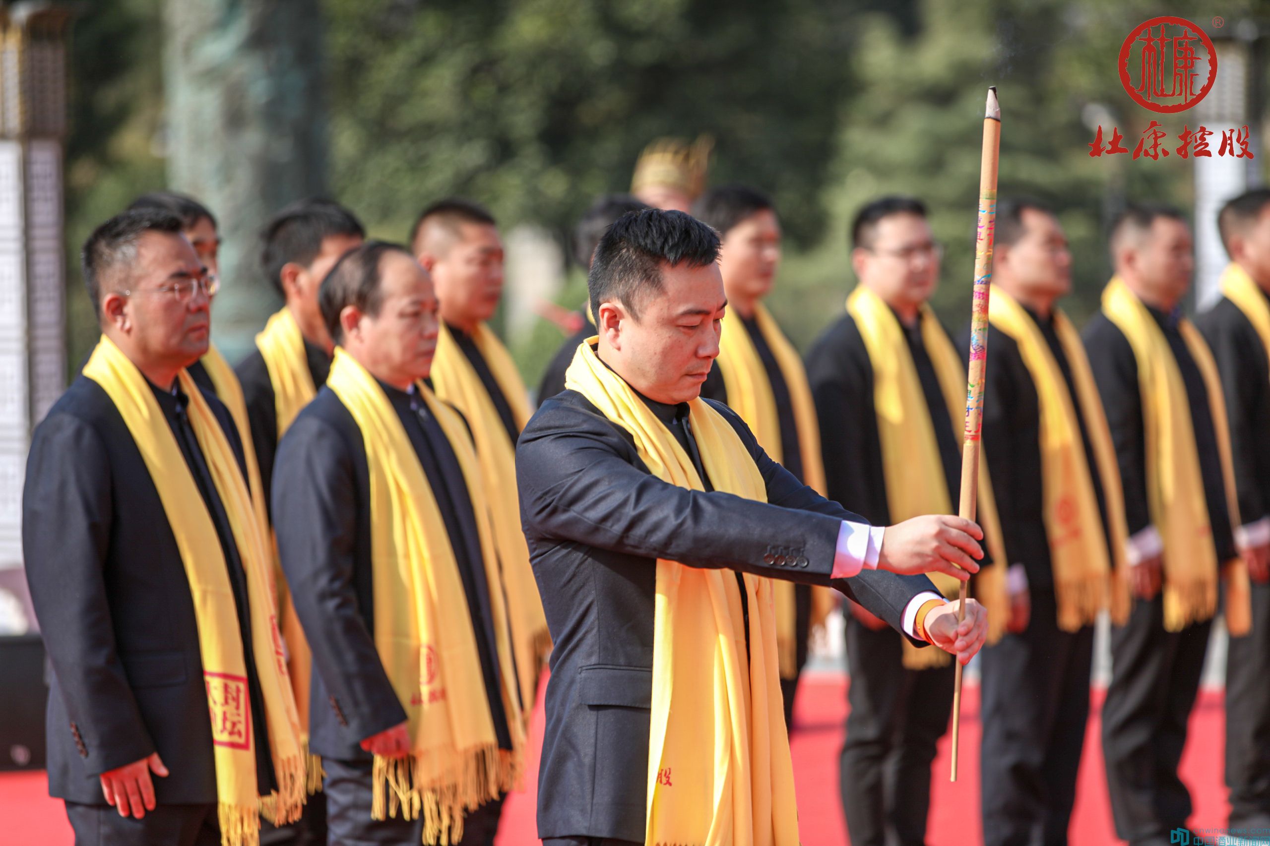 “累世傳承,鋪成大道。子孫尚享,飲水思源。祭祀儀式正式開始,禮請祭祀官。”隨著一聲嘹亮的呼號,洛陽杜康控股有限公司總經理王鵬、洛陽杜康控股有限公司生產基地總經理魏寶林、洛陽杜康控股銷售公司總經理肖志雄、洛陽杜康控股有限公司總工程師張獻敏、洛陽杜康控股銷售公司總經理助理兼小封壇事業部負責人武小嶺及杜康控股釀酒團隊,緩步登上祭祀臺。