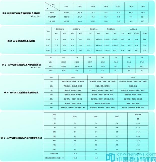 通過以上三個試驗可以看出,試驗一的原料粉碎度較粗,前兩輪的出酒率是控制住了,但正丙醇含量較高,并且后幾輪的正丙醇含量也不是太低,整個年度酒的質量在柔和細膩度上不是太好。試驗三的原料粉碎度較細,基本上按照茅臺的老工藝進行,但現在用的蒸汽不是原來自己燒的煤爐生產的,而是市企的公共供汽系統,氣壓高的過飽和蒸汽含水量少,在同樣的蒸料時間內,蒸料后很容易熟透,前兩輪出酒率高,正丙醇降下來了,但三四五輪酒出酒率低,出好酒的比例少了,按照試驗二是較理想的,但前提是前幾輪一定要控制好水分。