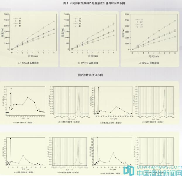 為填補業(yè)內研究空白,采用自制的通量測定裝置對不同孔徑酒用高分子過濾片進行流量實驗,再分別采用泡壓法和壓汞法對高分子過濾片孔徑大小及其分布進行了對比測定。由于高分子過濾片孔徑分布范圍較廣,使用壓汞法測定高分子過濾片的孔徑大小及分布比泡壓法更科學。此外,大孔的存在拉高了平均孔徑值,最可幾孔徑比平均孔徑更能科學和準確地反映酒用高分子過濾片的實際孔徑大小。