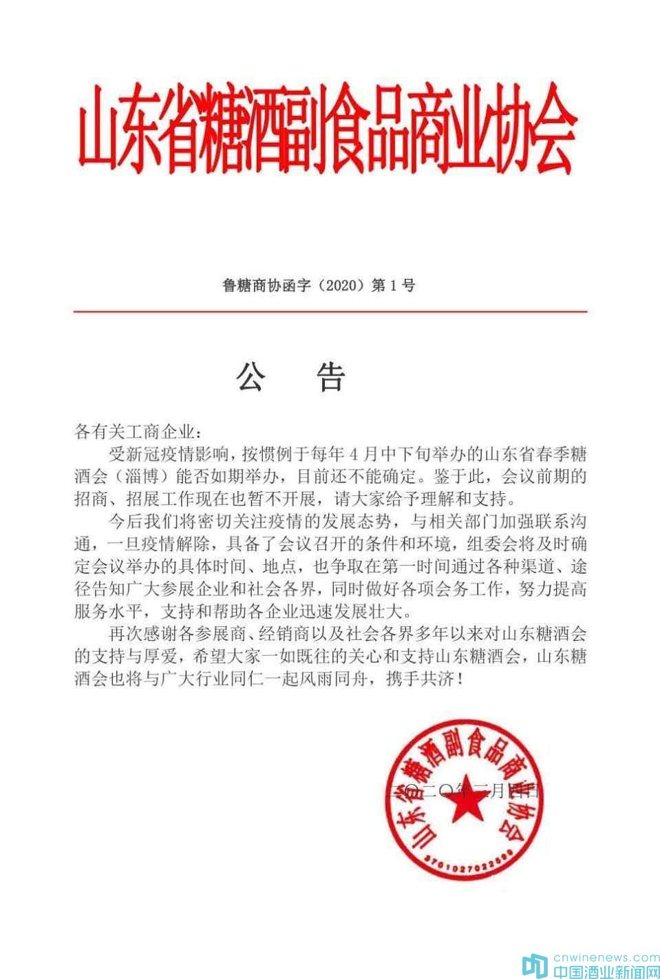 今天上午10:08,山東省糖酒副食品商業(yè)協(xié)會(huì)官方發(fā)出消息,受新冠疫情影響,按慣例于每年4月中下旬舉辦的山東省春季糖酒會(huì)(淄博)能否如期舉辦,目前還不能確定。鑒于此,會(huì)議前期的招商、招展工作現(xiàn)在也暫不開展,請(qǐng)大家給予理解和支持。