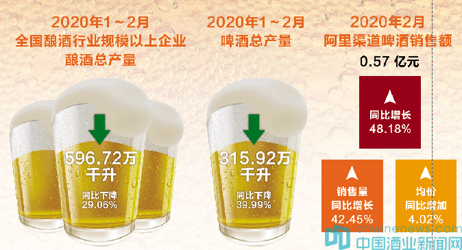 盡管來自國家統計局數據顯示,2020年1~2月,全國釀酒行業規模以上企業釀酒總產量596.72萬千升,同比下降29.06%。其中1~2月啤酒總產量315.92萬千升,同比下降39.99%。但是,有關專家提出,隨著3月份復工復產的有序推進,以及消費升級的加持,依然看好擁有高品質的品牌啤酒。