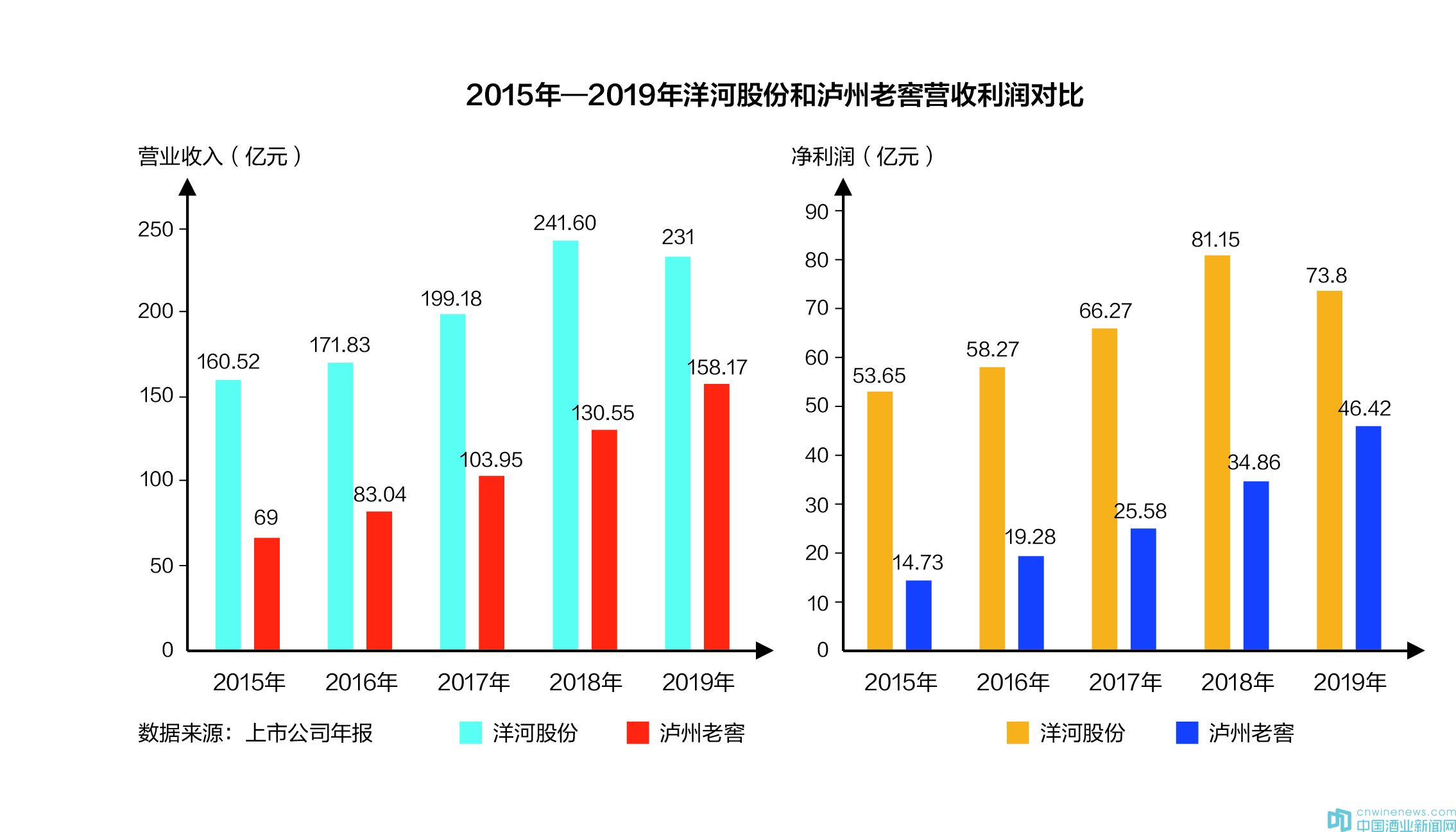 洋河“雙降”,除了意味與第二名五糧液差距拉大,也給后來者趕超的機會。瀘州老窖2019年年度報告顯示,2019年,公司實現營業收入158.17億元,同比增長21.15%;實現凈利潤46.42億元,同比增長33.17%。