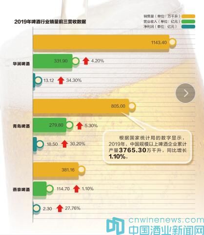 華潤啤酒(00291)、青島啤酒(600600)、燕京啤酒(000729)分別以1143.4萬千升、805萬千升、381.16萬千升的銷售量排在行業前三,營業收入分別為331.9億元、279.8億元、114.7億元,同比增長4.2%、5.3%、1.10%;實現歸屬于上市公司股東的凈利潤13.12億元、18.5億元、2.3億元,同比增長34.3%、30.2%、27.76%。