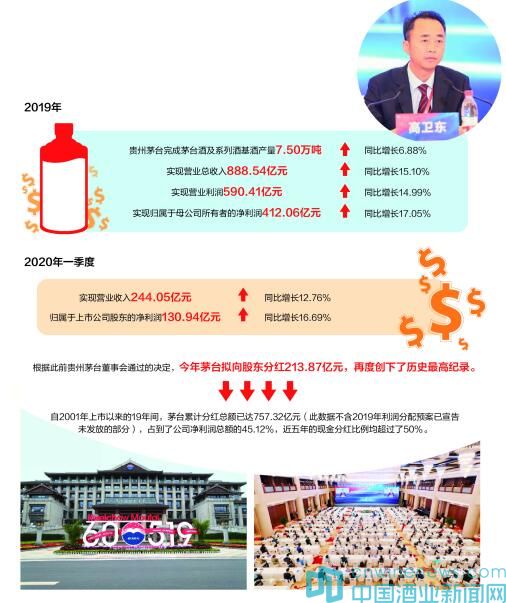 高衛東表示,“茅臺是守初心、負責任的企業,不敢辜負股東的信任。”根據此前貴州茅臺董事會通過的決定,今年茅臺擬向股東分紅213.87億元,再度創下了歷史最高紀錄。自2001年上市以來的19年間,茅臺累計分紅總額已達757.32億元(此數據不含2019年利潤分配預案已宣告未發放的部分),占到了公司凈利潤總額的45.12%,近五年的現金分紅比例均超過了50%。