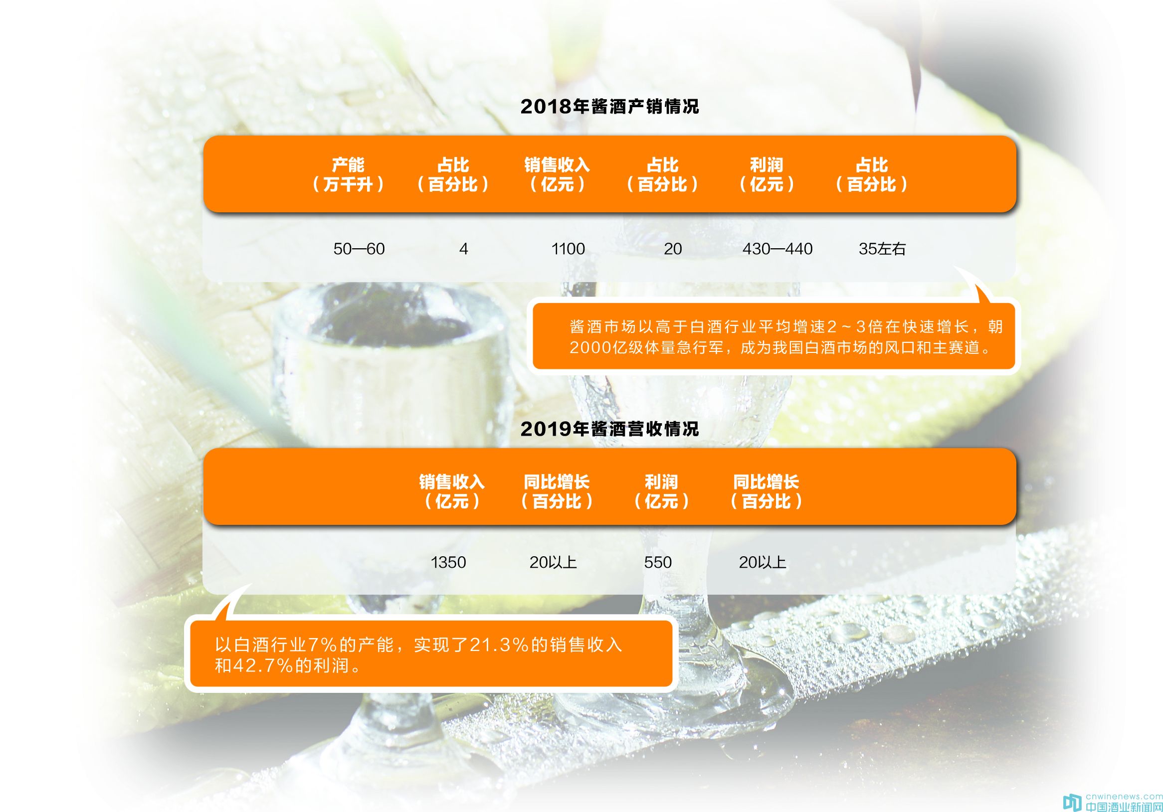 事實(shí)上,作為當(dāng)下行業(yè)最大的風(fēng)口,醬酒產(chǎn)業(yè)不可謂不熱。公開數(shù)據(jù)顯示,2019年,全國規(guī)模以上白酒企業(yè)實(shí)現(xiàn)銷售收入5617.82億元,其中醬香型白酒完成銷售收入1350億元左右,實(shí)現(xiàn)利潤約550億元,在銷售收入和利潤雙雙實(shí)現(xiàn)20%以上增長的同時(shí),以白酒行業(yè)7%的產(chǎn)能,實(shí)現(xiàn)了21.3%的銷售收入和42.7%的利潤。