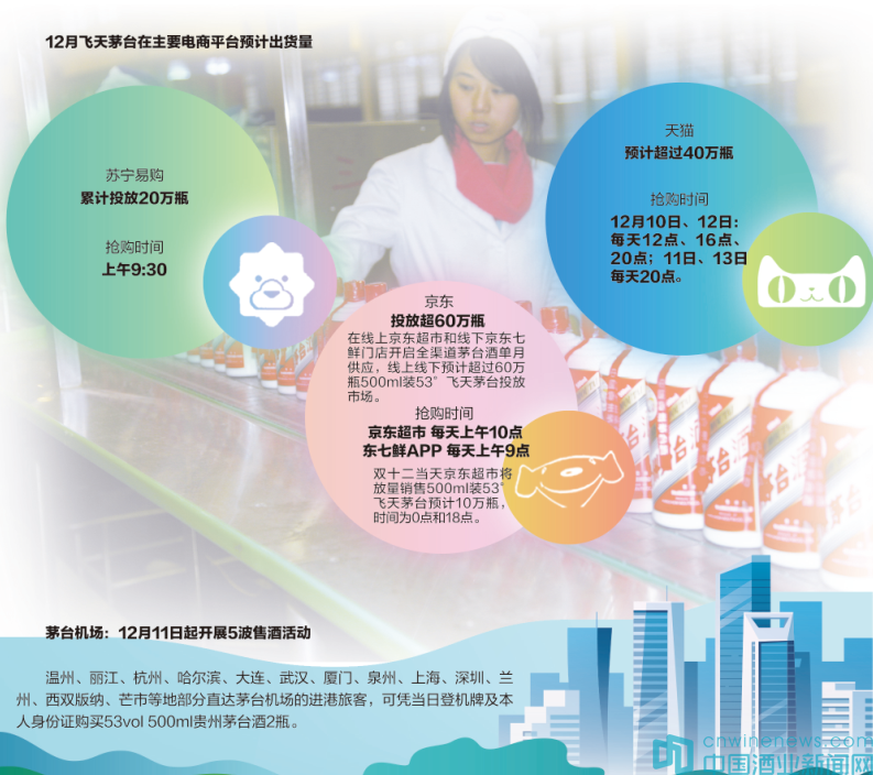 12月10日,京東宣布,線上京東超市和線下京東七鮮門店開始提供茅臺,計劃投放超過60萬瓶53度500ml裝飛天茅臺。12月10日,蘇寧易購放出消息,將在12月份放出50萬瓶53%vol500ml飛天茅臺酒。天貓超市也在12月10日宣布將在12月最大規模供應茅臺酒,預計超過40萬瓶53度500ml裝飛天茅臺投放市場。同時,蘇寧易購還將原來每天上午10:00搶購改為每天上午9:30開搶。