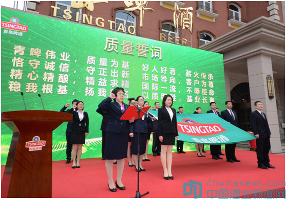 4月10日,青島啤酒第42屆質量月暨“提高質量紀念日”主題活動在青島啤酒廠舉行。今年的質量日,青島啤酒以“新跨越、再攀登、高質量、我貢獻”為主題,提出以攀登者的姿態,全方位打造魅力質量,成就質量“新高度”,不斷提高產品質量、服務質量和經營質量,讓消費者成為青啤高質量發展的受益者。當天,青島啤酒公司黨委書記、董事長黃克興,副總裁王瑞永,副總裁兼制造總裁、總釀酒師徐楠,工會主席孫靜,制造副總裁董建軍,制造副總裁汪巖以及來自部分工廠的負責人、釀酒師及技能人才、青啤忠實的消費者代表等參加了現場活動。
