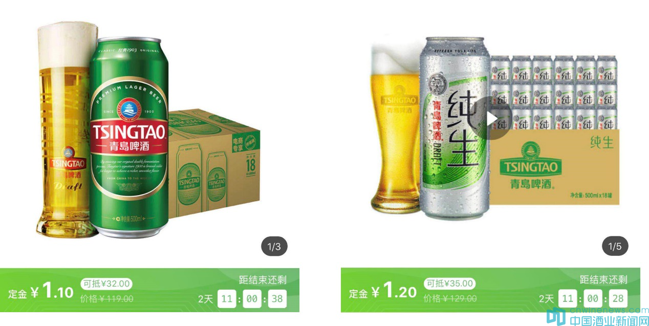 據了解,為給消費者帶來“搶鮮”驚喜,4月23日00:00至4月25日19:00期間,青島啤酒在直播間中設置了“膨脹金”,用戶提前進入直播間并支付小額定金,便可以在直播夜中參與到“經典1903——1.1元抵32元與青島純生——1.2元抵35元”活動,專享這兩款產品的驚喜抵扣價。
