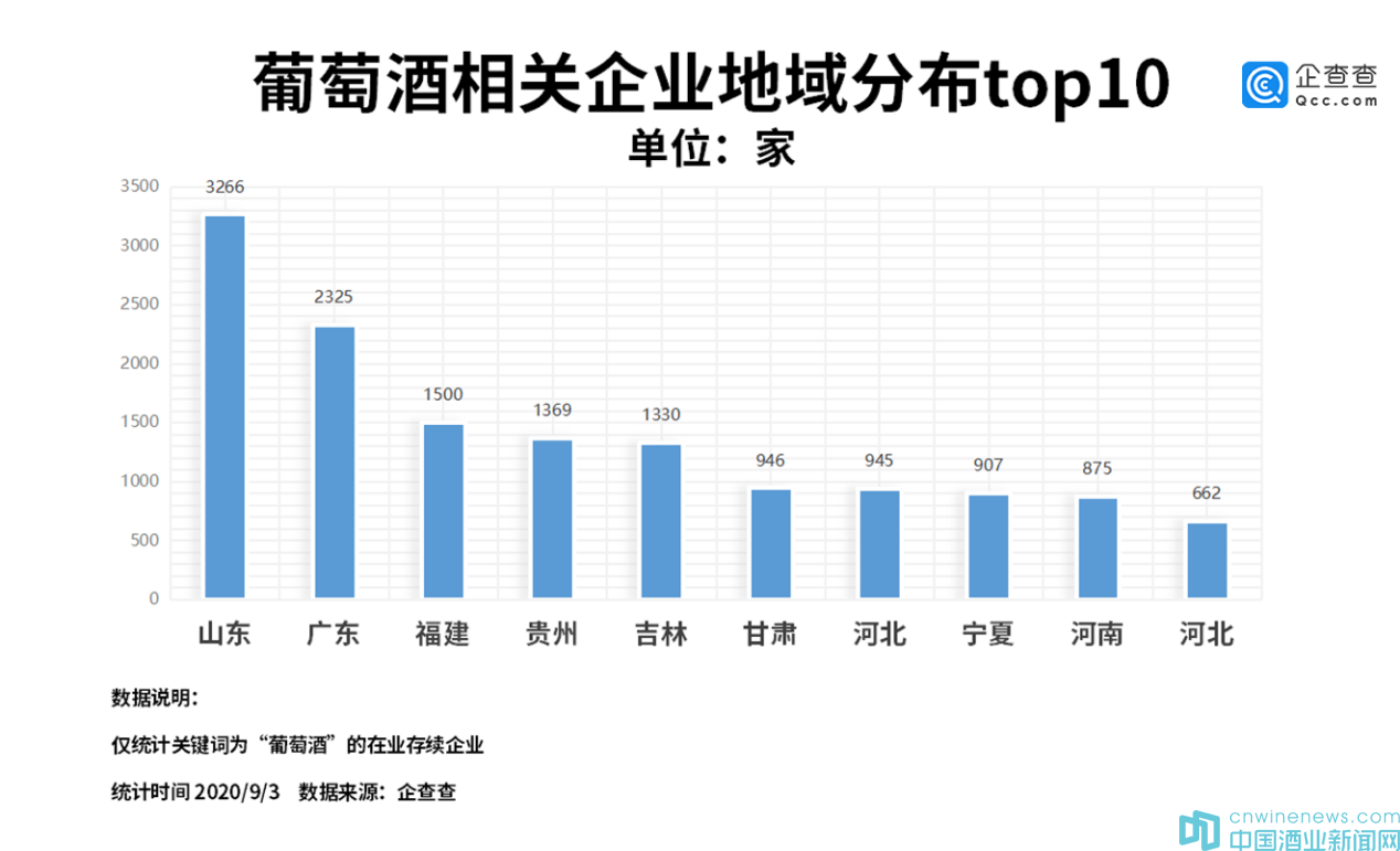 從地域分布來看,我國葡萄酒相關的企業數量較多的地區是山東,共3266家,廣東、福建分別以2325家、1500家分列二三名,貴州、吉林、甘肅等地緊隨其后。