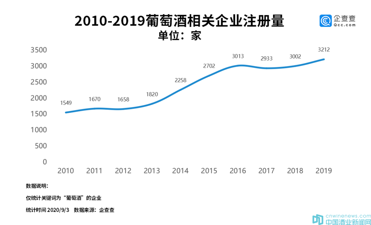 從企業發展情況來看,企查查數據顯示,過去十年來,我國葡萄酒相關的企業年注冊量平穩上升。其中2013年至2016年注冊量增長較快,2016年注冊量首次突破3000家,此后幾年數據有所回落。2019年注冊量為3212家,同比增長7.0%。