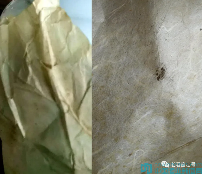 圖5上的綿紙質地致密,表面有很多褶皺,這些褶皺在兩種情況下能夠形成。一是紙張的材料質地。貴州仁懷地區產的“白綿紙”木質纖維多,韌性大,柔軟疏松,短時間折疊不會有褶皺。北方地區產紙張秸草纖維多,紙張致密硬脆,容易起褶皺。以此證明圖5上的綿紙非貴州仁懷地區所產。二是紙張的使用年代短。漫長的歲月能夠“撫平”一切褶皺。時間越長,紙張的疏松程度越大,紙張越疏松柔軟,其褶皺越少。圖5上的褶皺證明這層包裹紙使用的時間不夠長,不符合1980年至今40年的綿紙特征。(見圖8)