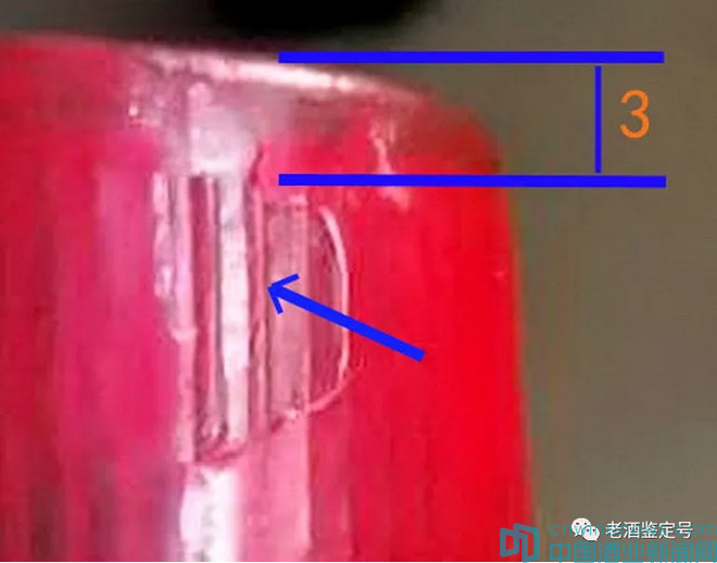 其四,疑品瓶蓋從頂部至防滑齒條頂部約3毫米,正品(見圖12)只有約2毫米,且二者頂蓋邊緣圓幅形狀不一樣。