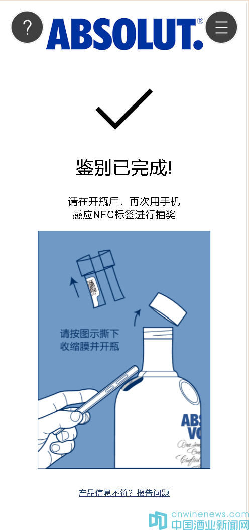 絕對®伏特加經典原味系列是保樂力加中國旗下首批賦能“樂鑒+”的產品,在1升、700毫升和200毫升三種產品規格上應用。通過用手機感應瓶身NFC標簽,消費者可以追溯產品從生產、運輸和銷售的關鍵時間點。開瓶后再次感應NFC標簽,即可參與互動抽獎,有機會贏得多重禮遇。此外,消費者仍可以掃描瓶頸處二維碼快速獲取產品追溯信息,開瓶后輸入三位驗證碼對產品進行鑒別,體驗新升級的“鑒別雙通道”。