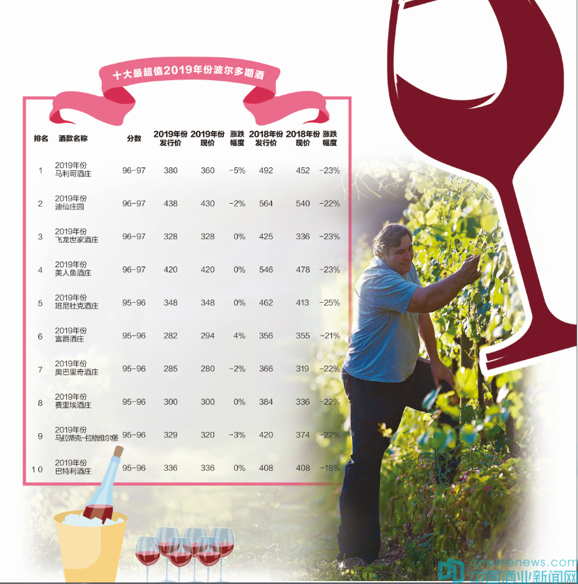 我綜合考量了品質(我的評分)、初始發布價和當前價格,較之2018年份價格的漲跌幅以及市場地位,形成了我的“十大最超值2019年份波爾多期酒”清單。