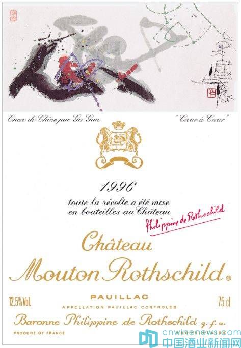 1996年對(duì)于波爾多來說是難得的好年份之一,這一年的波爾多葡萄酒受到了評(píng)論界廣泛的好評(píng)。1996年份的酒標(biāo)設(shè)計(jì),木桐酒莊選擇了與中國畫家兼書法家古干合作。該年份的酒標(biāo)加入了中國書法的元素,采用水墨畫的方式描繪出五個(gè)不同顏色的“心”字,極富視覺沖擊又寓意深遠(yuǎn)。