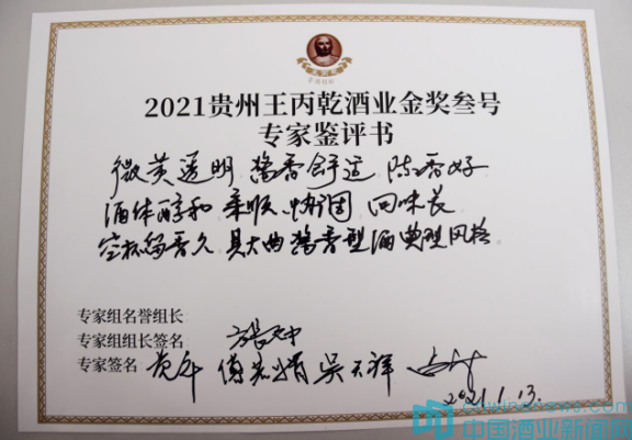 經過一個多小時的品評,專家組以嚴謹的專業精神,嚴苛的專業要求、嚴實的專業態度,本著公平、公開、真實的原則對王丙乾金獎叁號進行了評鑒。在召開閉門會議之后,專家組向參會人員公布了“王丙乾金獎叁號”的綜合評定意見。王丙乾金獎叁號:微黃透明,醬香舒適,陳香好,酒體醇和,柔順,協調,回味長,空杯留香久,具大曲醬香型酒典型風格。