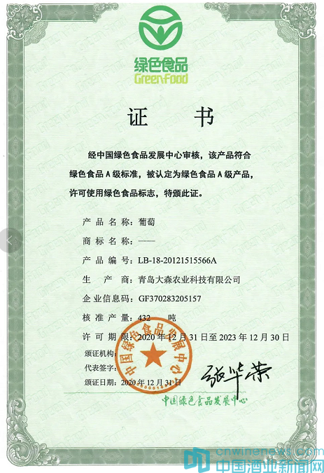 日前,經中國綠色食品發展中心審核確認,青島大森葡萄基地(大森莊園)葡萄符合綠色食品A級標準,被認定為綠色食品A級產品,許可大森莊園葡萄使用綠色食品標志。這是自大森葡萄酒獲得“中國馳名商標”、“中華文化名酒”、“中國綠色食品”、“國際葡萄酒大獎賽金獎”、“釣魚臺宴會用酒”等榮譽稱號后的又一殊榮。