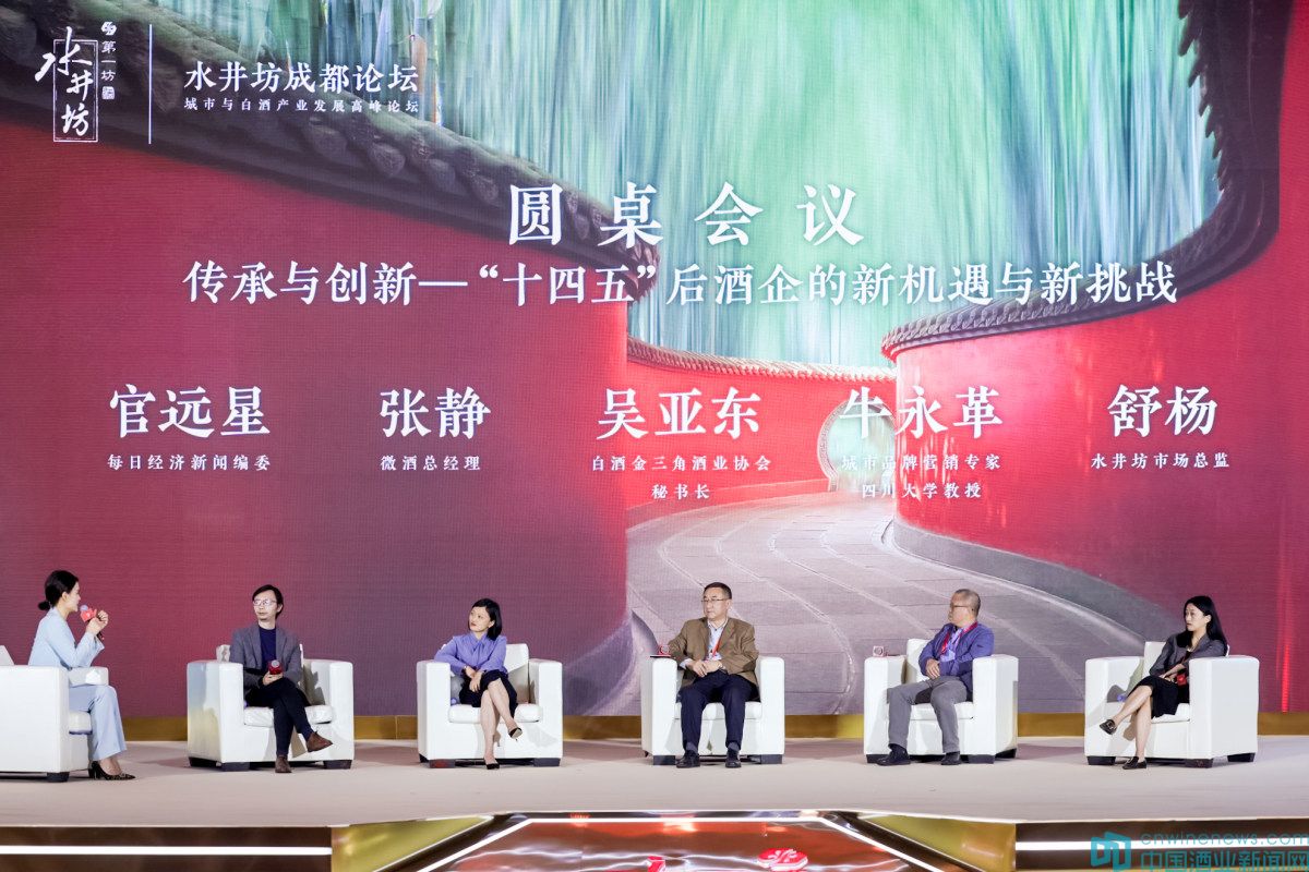 此外,作為本次論壇的重頭戲,圓桌對話環節更是精彩紛呈。在由四川廣播電視臺新聞頻道著名美女主持人程玥的精彩主持下,四川中國白酒金三角協會常務秘書長吳亞東、每日經濟新聞編委官遠星、城市營銷專家牛永革及四川水井坊股份有限公司市場總監舒楊等專家學者圍坐在一起,以《傳承與創新——“十四五”酒企的新機遇與新挑戰》為題坐而論道。