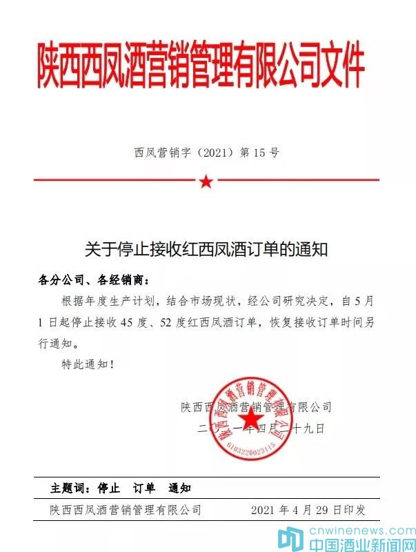 根據年度生產計劃,結合市場現狀,經公司研究決定,自5月1日起停止接收45度、52度紅西鳳酒訂單,恢復接收訂單時間另行通知。