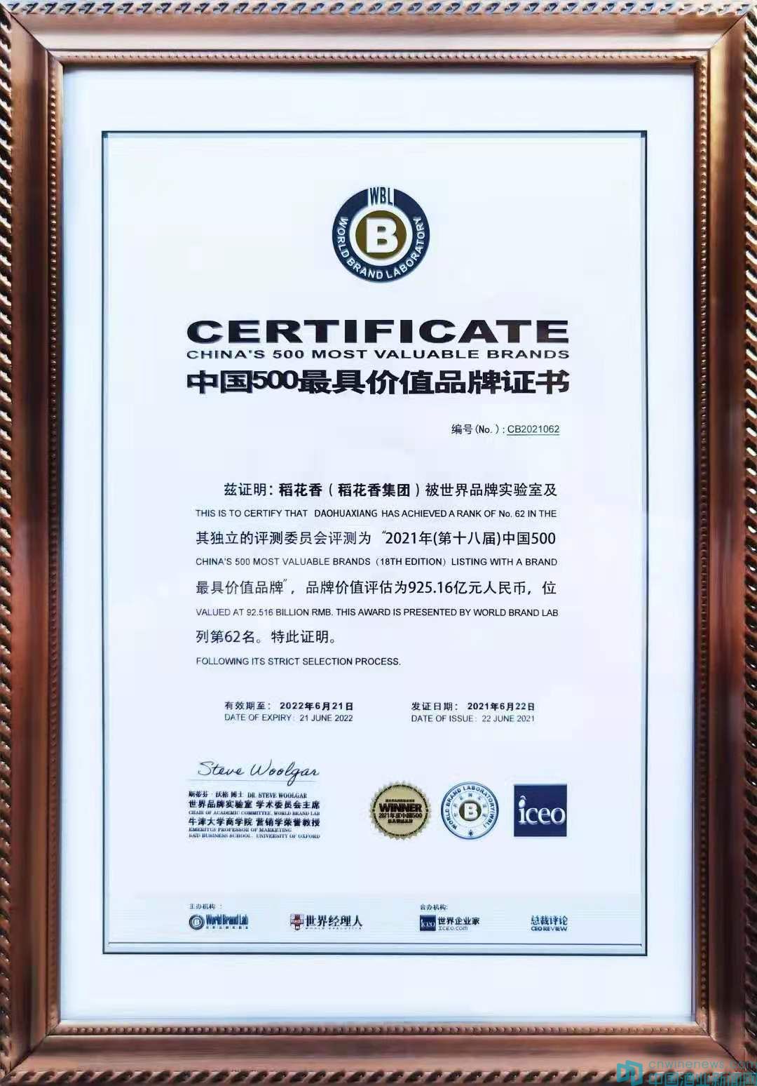 6月22日,以“可持續品牌助推公司增長”為主題的第十八屆世界品牌大會在北京舉行,會上發布了中國500最具價值品牌榜單。稻花香以925.16億元的品牌價值連續18年上榜,位居總榜單第62位、食品飲料行業前十強、白酒行業第四位,品牌價值較去年增長119.3億元。