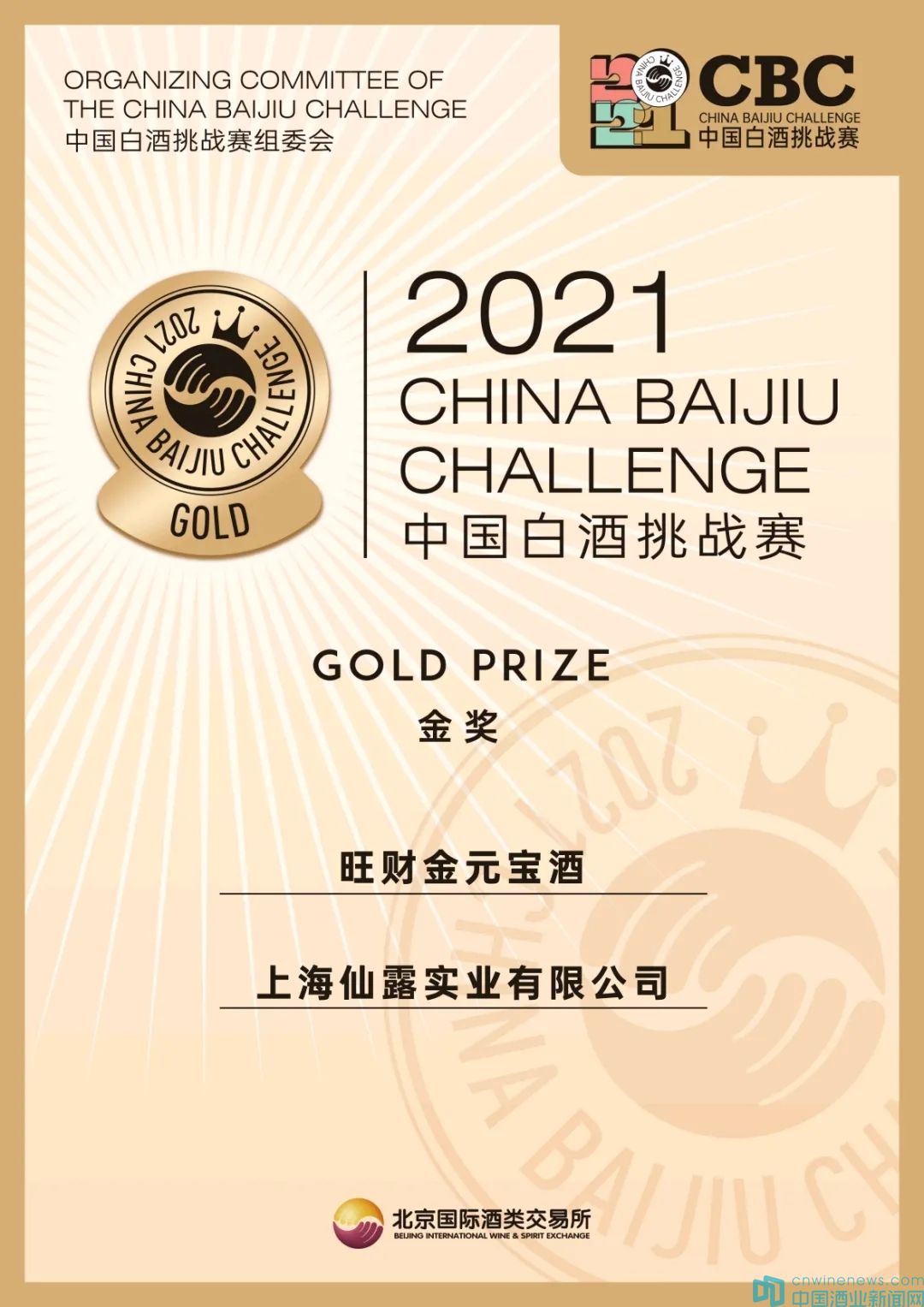 2021年7月23日,備受矚目的2021中國白酒挑戰(zhàn)賽CBC經(jīng)過為期一周緊張的分數(shù)統(tǒng)計和核對工作,評選結(jié)果最終揭曉。此次挑戰(zhàn)賽,上海仙露實業(yè)有限公司參評的旺財金元寶酒憑借雄厚的品質(zhì)實力在眾多產(chǎn)品中脫穎而出,一舉奪得大賽金獎。