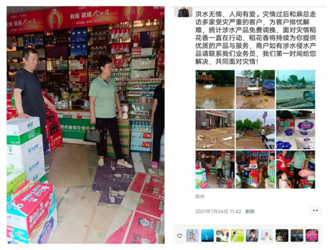 同時,面對災(zāi)情,稻花香河南市場營銷人員迅速行動,靠前作戰(zhàn)。豫東分公司營銷團(tuán)隊趕到災(zāi)情嚴(yán)重的安陽市場,和經(jīng)銷商一道開展搶險救災(zāi),組織貨物轉(zhuǎn)移。20余人、7臺車,一個星期的時間走訪800多家客戶,了解受災(zāi)情況,調(diào)換部分水淹產(chǎn)品。豫北分公司、豫南分公司迅速摸排各市場客戶情況。在受災(zāi)嚴(yán)重的新密市場,面對斷水?dāng)嚯姷那闆r,業(yè)務(wù)經(jīng)理與經(jīng)銷商一起,3天時間走訪100多家客戶,為他們送去方便面、礦泉水等生活物資。