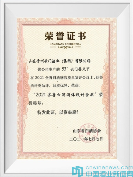 并且,在2021全省白酒感官質量鑒評會議上,榮獲“2021齊魯白酒酒體設計金獎”的榮譽稱號。