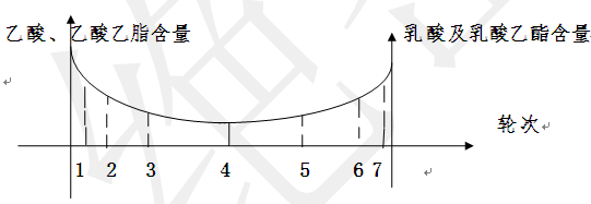 特點: 1、2、3輪次酒乙酸、乙酸乙脂含量 逐漸降低,第4個輪次是1--7個輪次的綜合平衡特點,從4--7個輪次酒乳酸及乳酸乙酯含量逐漸升高。