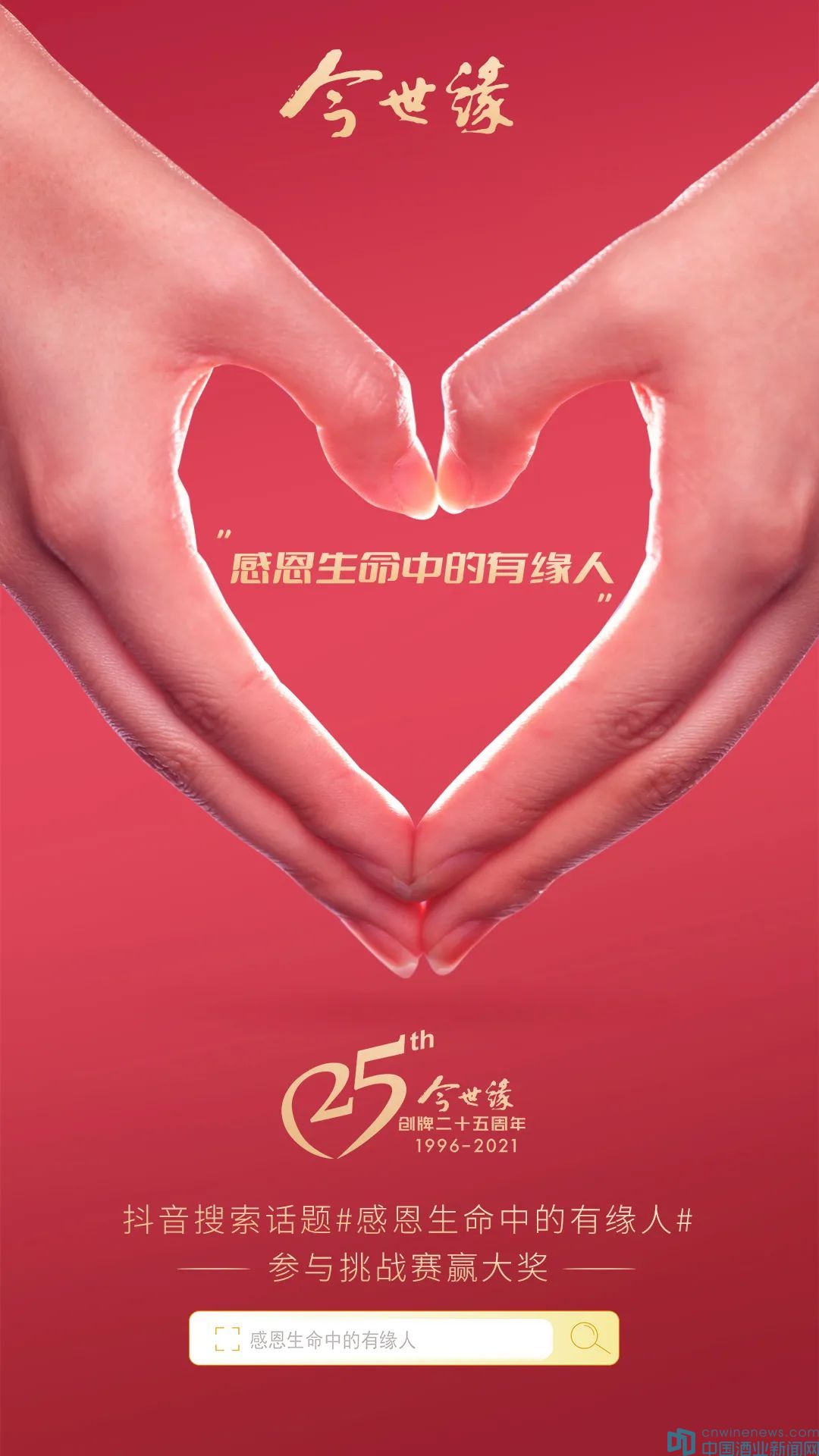 8月25日-9月8日,抖音搜索話題“感恩生命中的有緣人”,關(guān)注@今世緣酒業(yè)抖音官方賬號,使用指定貼紙“感恩有緣人”拍攝視頻并發(fā)布,或創(chuàng)作感恩有緣人的視頻內(nèi)容,就有機(jī)會贏取今世緣酒業(yè)25周年感恩禮,點(diǎn)贊量越多、視頻越優(yōu)秀,越有機(jī)會贏大禮!