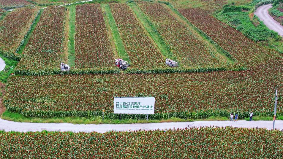江小白高粱產業園正在收割高粱。