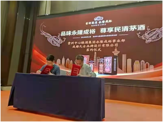 會上,貴州中心釀酒集團永隆成裕事業部總經理楊春華,對各位專家、大咖、經銷商朋友的到來,表示熱烈的歡迎,并表示愿意與大家共同分享永隆成裕的品牌紅利和資源優勢,實現互利合作、共贏共享。并現場與成都九古品牌設計有限公司董事長張繼謝完成簽約。