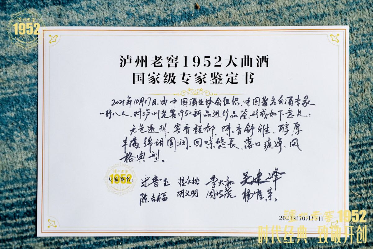 在發布會當天舉行的“瀘州老窖1952”專家鑒評會上,由中國酒業協會組織,中國酒業協會理事長宋書玉、四川中國白酒金三角協會副會長陳吉福、教授級高級工程師李大和、原四川大學食品與發酵工程研究所教授胡永松、江蘇蘇酒集團副總裁周新虎、江蘇今世緣股份有限公司副董事長吳建峰、高級工程師胡義明、四川省酒業集團有限責任公司總經理、總工程師楊官榮八位著名白酒專家對瀘州老窖1952進行了專業品鑒,最終形成了對瀘州老窖1952酒體特色的一致鑒評——無色透明,窖香馥郁,陳香舒雅,醇厚豐滿,綿甜圓潤,回味悠長,落口爽凈,風格典型。瀘州老窖1952傳承697年釀酒名門的濃香風骨,收獲了專家鑒評團的高度肯定。
