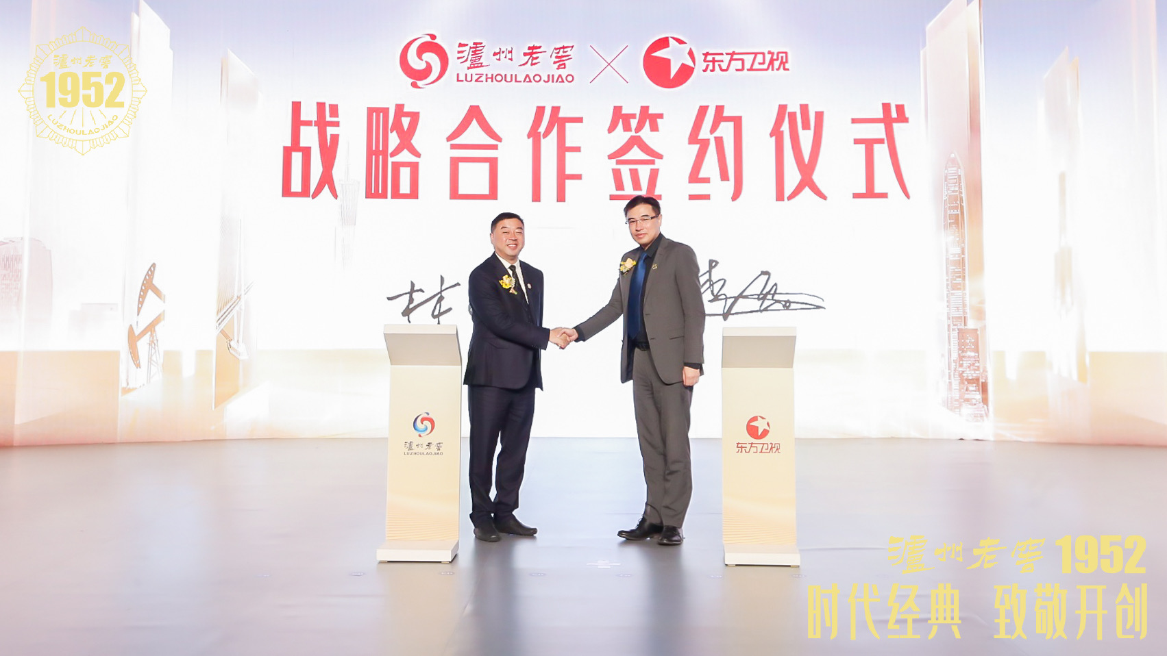 (瀘州老窖股份有限公司黨委副書記、總經理林鋒,東方衛視中心黨委書記、總編輯李逸分別代表瀘州老窖與東方衛視完成戰略合作簽約)