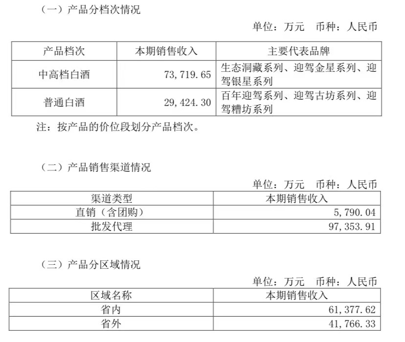 其中,第三季度的中高檔白酒銷售收入為7.37億元(生態洞藏、迎駕金星、迎駕銀星系列),普通白酒為2.94億元(百年迎駕、迎駕古坊、迎駕糟坊系列);直銷(含團購)的銷售收入為5790萬元,批發代理為9.74億元;省內銷售收入為6.14億元,省外銷售收入為4.18億元。