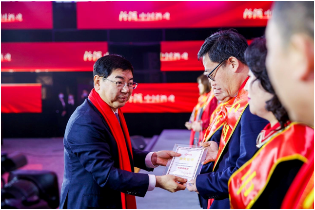 (汾酒黨委書記、董事長(zhǎng)袁清茂上臺(tái)為獲獎(jiǎng)企業(yè)代表頒獎(jiǎng)!)