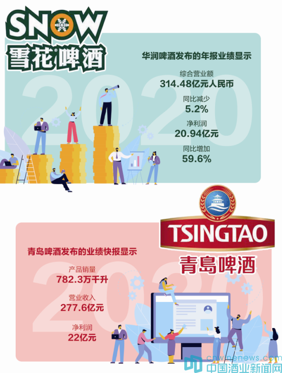 3月22日,華潤啤酒(00291.HK)在港交所發布2020年度業績報告稱,在營收略有下降的同時,實現了凈利潤的大漲。而截止到3月23日,青島啤酒(600600.SH)發布的業績快報也同樣顯示,在營收略降的同時,實現了凈利大增。