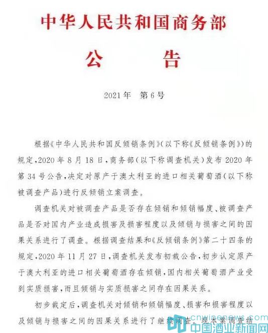 在此之前,應(yīng)中國國內(nèi)相關(guān)葡萄酒產(chǎn)業(yè)申請(qǐng),商務(wù)部分別于去年8月18日和8月31日發(fā)布公告,對(duì)原產(chǎn)于澳大利亞的進(jìn)口相關(guān)葡萄酒發(fā)起反傾銷和反補(bǔ)貼調(diào)查。立案后,商務(wù)部嚴(yán)格按照中國相關(guān)法律法規(guī)和世貿(mào)組織規(guī)則進(jìn)行調(diào)查,并做出上述最終裁定。