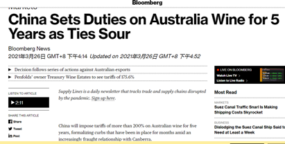 彭博新聞(Bloomberg)對(duì)此評(píng)論稱:“中國與澳大利亞葡萄酒的戀情以破裂告終。”