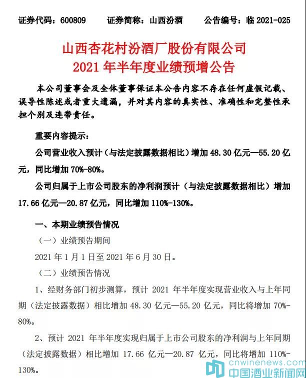 7月13日,山西汾酒發布2021年半年度業績預增公告(簡稱公告)。根據相關數據推算,山西汾酒2021年上半年預計營業收入117.29億元~124.19億元,與2019年全年業績(118.80億元)相當;山西汾酒2021年上半年實現凈利潤33.70億元~36.91億元,超越2020年全年的30.79億元。根據數據對比,2021年上半年,山西汾酒繼續以70%以上的營收增長,實現了與2019年全年比肩的營收業績,以110%以上的凈利潤同比增長,超越2020年全年的凈利潤。