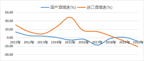 圖3:2011-2020年國產酒、進口酒增速變化情況