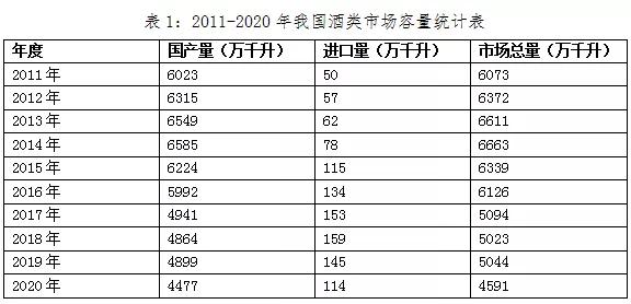 “十三五”期間,在消費升級的帶動下,酒類消費理念也隨之發生變化,“少喝酒、喝好酒”逐漸成為消費趨勢。我國酒類消費市場容量基本上到達頂點,規模穩定在5000萬千升左右(見表1)。