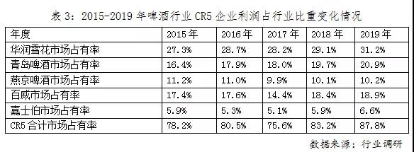與此同時,生產端行業集中度上升,頭部企業市場占有率大幅提升。以消費量最大的白酒和啤酒為例,白酒行業前六大名酒企業(茅臺、五糧液、洋河、瀘州、汾酒、古井)2019年利潤總額占行業比重53.18%,較2015年提高近13個百分點。啤酒五大集團(華潤雪花、青島啤酒、燕京、百威、嘉士伯)2019年市場占有率達87.8%,較2015年提高近10個百分點。
