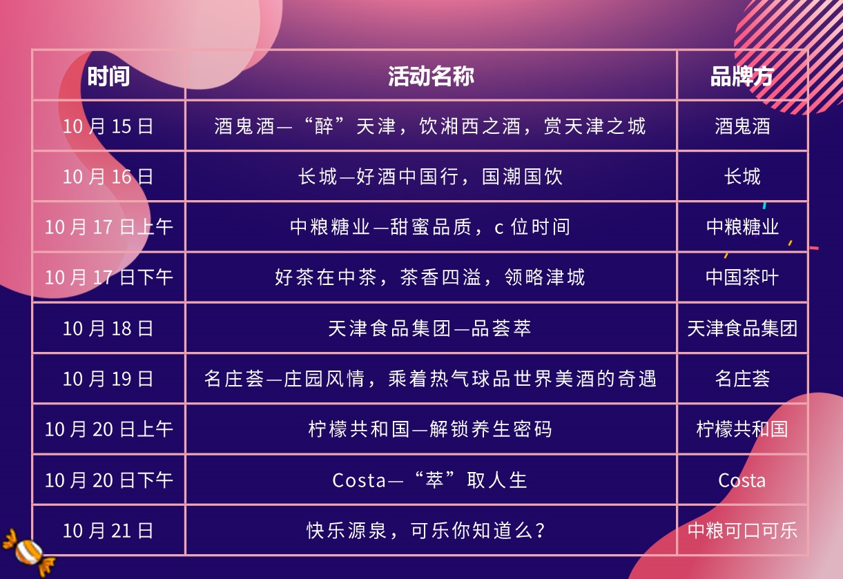 在全國糖酒會歡樂購舉辦期間,精彩活動不斷,品牌宣推方式創新不停。酒鬼酒的“醉”天津,飲湘西之酒,賞天津之城;中糧長城的好酒中國行,國潮國飲;中糧名莊薈的莊園風情,乘著熱氣球品世界美酒的奇遇;天津食品集團的品薈萃,“食”天津美食,品王朝好酒;中糧糖業為品牌全新升級打造的“甜蜜品質,c位時間”;中國茶葉打造的好茶在中茶,茶香四溢,領略津城;中糧可口可樂的快樂源泉,可樂你知道么?周清黃酒,品紹興名酒;德國格蘭特咖啡,隨時隨地品味100%香醇咖啡;檸檬共和國,帶你窺探養生密碼;曼士元,了解明星益生菌。近百家品牌三百余款產品將亮相全國糖酒會歡樂購活動現場。