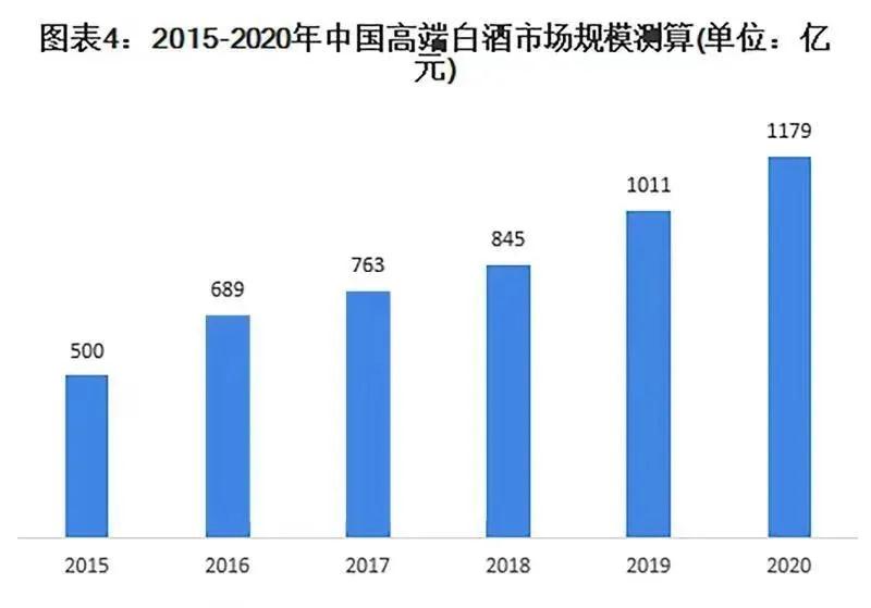 根據(jù)Euromonitor的數(shù)據(jù)顯示,2019年高端白酒的市場(chǎng)規(guī)模約為1011億元;至2029年,高端白酒市場(chǎng)規(guī)模將達(dá)到1600億元,年平均增長(zhǎng)率在4.70%;基于上述數(shù)據(jù),經(jīng)過(guò)初步估算,2020年高端白酒的市場(chǎng)規(guī)模約在1179億元。
